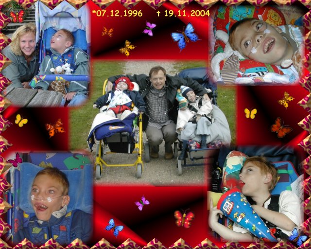 4.Schluß Eric ist jetzt 3,5 Jahre alt und seine Dreierkombi funktioniert gut, obwohl er nicht anfallsfrei ist. Aber er ist beim Krampf nicht mehr konvulsiv, sondern sehr tonisch mit Zähneknirschen und Schreien. Leider hat er aber sehr starke Kopfschmerzen beim Krampfen. Er kann nicht einschlafen ohne Anfälle, aber es geht ihm deutlich besser. Fünf Anfälle hat er noch und das ist für ihn wenig. Leider ist sein Gehirn sehr angegriffen von den Anfällen. Ein MRT hat aber nichts Konkretes an Problemen zeigen können, warum er solche Bewegungsstörungen hat. Das Gehirn ist nicht sehr gut noch nicht mal gut, aber auch nicht so schlecht, dass man sagen könnte, daher entwickelt er sich nicht. Das Kleinhirn ist deutlich zu klein und das ist auch der Grund, warum die Motorik nicht so funktioniert. Mit der Petö-Therapie versuchen ihn die Leute zum Stehen zu bekommen, aber er ist halt deutlich zu lang, zu dünn und zu instabil. Mit 108cm und 11 kg ist Eric ein Storch. Aber gesundheitlich ist er auch schlecht dran. Jetzt kommen häufig Bronchitiden mit starker Obstruktion zur Mittelohrentzündung hinzu. Im März lag er mit einer schweren Lungenentzündung und hohem Sauerstoffbedarf auf der Halbintensivstation (Wir weigerten uns auf die Intensiv zu gehen) und wir dachten er will nicht mehr, er will sterben. Die Infektionen nehmen immer mehr zu und wir denken, dass es der Preis für die Medikation ist. Wir wollen auch Sauerstoff nach Hause nehmen, da wir seine Bronchitis zu Hause behandeln und er blaue Lippen und Finger bekommt. Aber Eric geht auch jetzt in den integrativen Kindergarten und wir haben noch viel vor mit ihm, denn er hat genug gelitten und wir wollen, dass er sich vielleicht so weiter entwickelt, auch wenn die Athetose immer stärker wird. Wenn Eric kämpft, denn helfen wir ihm, aber wenn alles irgendwann doch zu viel wird, dann wollen wir ihn auch gehen lassen, denn er musste schon sehr viel erdulden. Eric ist motorisch und gesundheitlich schlechter gestellt als vor zwei Jahren und insgesamt macht er mehr Arbeit als ein drei Monate altes Baby, aber er versteht auch viel, auch wenn er nichts sagen kann und Eric liebt Musik. Wir haben keinen Moment bereut, dass er diesen schweren Start ins Leben geschafft hat, wir lieben ihn trotz oder gerade wegen seiner Behinderungen. Am 19.11. verstarb leider auch Fionas großer Bruder Eric an den Folgens einer Frühgeburt |