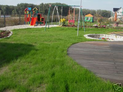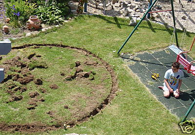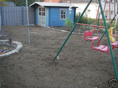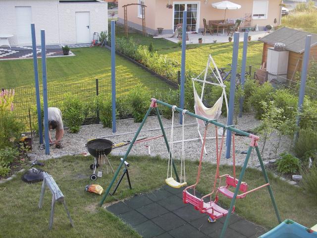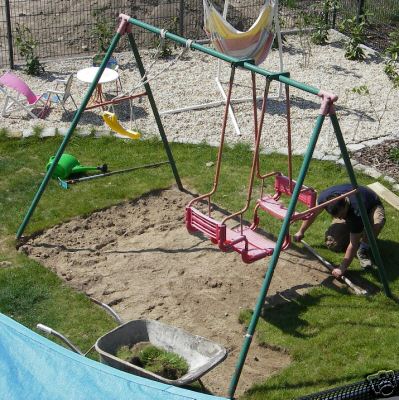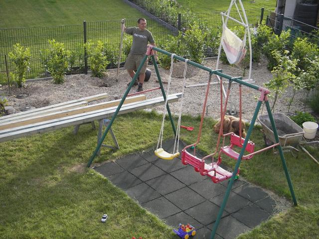 Ende April 2007 - weiter gehts mit viel Mühe - die Fallschutzplatten müssen unter die Schaukel, dazu erstmal der Rasen wieder raus ...