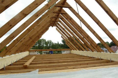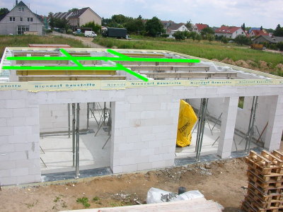 Montag - 15.08.2005 - das Dach ist zu ! und Mittwoch die Ziegel fast alle drauf - Fenster drin, unten die Stützen raus----