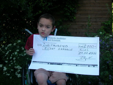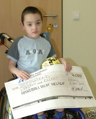 DANKE !!!! möchten wir hiermit allen sagen, die uns mit Spenden bisher unterstützt haben !! (¯`v´¯) Besonders gerührt hat mich die Spende einer alleinerziehenden Witwe von 1000.- Euro, die gerade erst selbst Ihren geliebten Mann verloren hatte, die gerne aus Dankbarkeit für drei gesunde Kinder etwas spenden wollte und uns für dieses Vorhaben aussuchte. DANKE für diese Ehre !!!! (¯`v´¯) Wir wissen dieses Opfer zu schätzen und trauen uns kaum dieses anzunehmen Auch ein dickes Danke den vielen Mamas aus "Babyzimmer" und "Rund ums Baby" für die vielen Pampersbärchen, Realsterne, Milchtaler und Sachspenden !!! ~~~~~~~~~~~~~~~~~~~ Auch Handball hilft helfen hat ein großes Herz für Ellert und für Ellert viele tolle Aktionen gestartet, wofür wir unendlich dankbar sind ! Am 09.07. erhielt Ellert einen großen und noch viel großzügigeren Scheck der Aktion wofür wir allen beteiligten 1000 mal DANKE sagen wollen ! ~~~~~~~~~~~~~~~~~~~~ Fast ein Jahr später - am 06.05.2006 hatten wir die Ehre, erneut aus der Aktion, dieses mal von den Nürnberger Handballspielerinen, 2000.- Euro zu erhalten, wofür diese 1 Jahre gesammelt haben - DANKE auch für ein unvergessliches Wochenende mit Euch - Foto zeigt Ellert mit seinem und Vincents gemeinsamen Scheck - wurde brüderlich geteilt !!! ~~~~~~~~~~~~~~~~~~~~